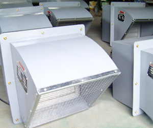 WEXD系列风机采用先进的前掠型叶片、低噪音的外转子或内转子风机专用电机直联传动,方形外壳设计可以方便地安装在混凝土墙、砖墙或轻钢压型墙板上,方形防雨罩结构牢固,外形美观。具有噪声低、风量大、运行可靠、性能参数范围广、安装简便等特点,广泛应用于厂矿企业车间和民用、商用建筑工程的边墙壁式通风换气。根据输送介质的要求,可制成防腐、防爆型。 WEXD(WEX)系列风机一般用于边墙壁式排风,配设45°防雨罩(或特殊制造成60°)和防虫网(夜间可防止昆虫循灯光飞入车间)。可按需要制成边墙送风机型号为DWSP(WSP),配设90°防雨罩(防风、雨、尘)和防虫网(夜间可防止昆虫循灯光飞入车间)。附件选配:重力式止回风阀(可确保车间在风机不开时保持与室外隔绝),订货时注明。
